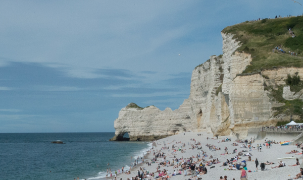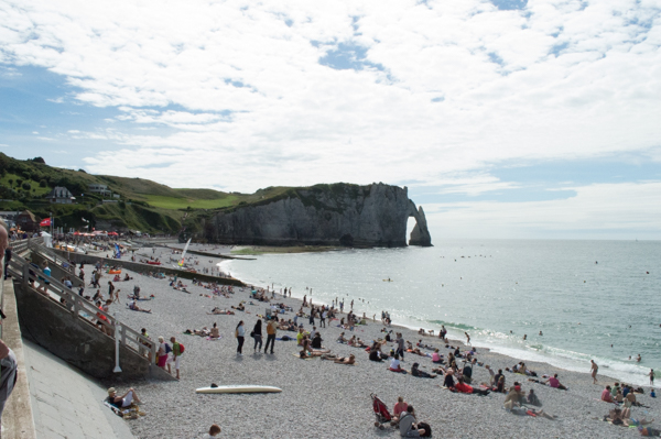 After bidding farewell to Fécamp, we moved a few dozen kilometers down the coast to Etretat. We had put it on our list when we saw a French police movie that was filmed in Etretat, and it looked like a lovely place. It is a lovely place, but I’m now pretty certain that the movie was NOT filmed on the day after National Day on a four-day weekend. Check out these beach crowds: