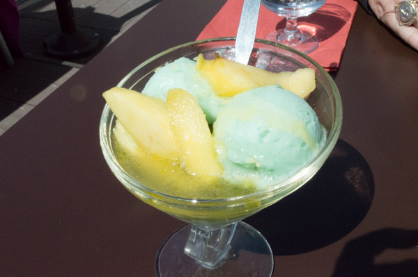 Since we had lunch in Fécamp, we felt obliged to have dessert in Etretat. It seems that the Normandy region has its version of apple pie, in the sense that if nothing is more American than apple pie, then nothing is more Norman than “Coupe Normande”, a melange of peppermint sorbet and apples, all swimming in calvados, a local apple brandy. Yummmmm.