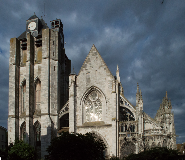 Back at “home”, we are not tired of our neighbor, the church of Our Lady (Eglise Notre Dame) of Louviers, seen here with the setting sun reflecting off the window across from our front yard.