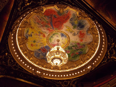 Since we were in the neighborhood, we took a look inside the Garnier Opera (I showed you a picture of the outside a few days ago). The chandelier is worth seeing, not only for itself but also for the Chagall background. Again, scale is hard to represent–just know that that little bauble of light weighs in at a cool seven tons. And that means you want to be careful about your seat selection; the chandelier falling in Phantom of the Opera was based on a real event in the 19th century.