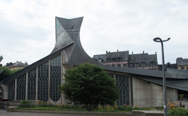 For this visit, we set aside our deeply ingrained sense of individualism, ripped the Rouen pages out of the Rick Steves guidebook, and followed his walking trail. The first stop is a remarkable structure built in 1979 to honor Ste. Jeanne d’Arc (Joan of Arc). To refresh your memory, Joan was burned at the stake in 1431 at the age of 19 for trumped-up charges of heresy, but really for her efforts to run the English out of France during the 100 Years War. Her case was later re-opened and she was made a saint in 1920. Whatever your position on that topic might be, you should appreciate a quote on the walkway approaching the entry to the church, attributed to André Malraux, an early 20th century novelist: “O Joan, without a grave and without a portrait, you who know that the tomb of the hero is in the heart of the living.” (my translation).