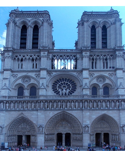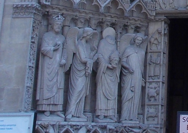 On the other end of the bridge, you find one of the most impressive structures in Europe: Notre Dame. Besides being the center of the Catholic church in France, it is also the locus of one of Victor Hugo’s most beloved novels. It’s hard to see the detail in this photo, but to give you a taste of it, below is a close-up of the left side of the left-most of the three portals. Notice the second figure from the right. Remember St. Denis?