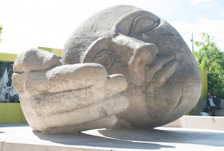 Outside the building, we found two very different signs of authentic Parisian life. One one side of the building, accessible to Les Halles, Le Bourse, and the emerging Nelson Mandela Garden, was this 65-ton, sculpture by Henri de Miller, L’Ecoute (The Listening). It’s new, having been installed in 1986. (Note the man standing just to the right to get a sense of the size of this sculpture.)