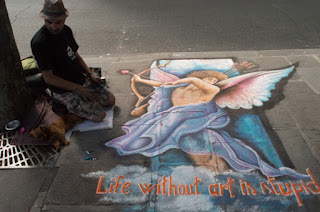 In case you have a hard time reading it, his caption says “Life without art is stupid.” We were standing in front of Hotel de Ville (city hall), and after tossing a euro into his collection cup and taking his picture, I asked him why his caption was in English and not French. After all, he could be saying that the French understood art better than the English-speaking world, and I wasn’t sure I was ready to just stand aside and let him make that claim unchallenged. But he just shrugged his shoulders as if to say “I don’t know the English word for marketing.”