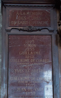 The church is at the heart of an area undergoing major restoration. The area in the foreground is being rebuilt as the Nelson Mandela Garden. When finished, it will be surrounded by the Bourse (Paris’s major stock exchange), Les Halles, a recently renovated market center, and, and this magnificent church. The parish has a history going back over 800 years. In the center of the nave the visitor finds a memorial to the parish priests throughout its history. The list starts will single-name priests (Simon), evolves through names like “Guillaume de Corbeil”, and finally arrives around 1490 with modern first-last names like “Jean Balue”. Maybe in my next career I’ll be a historian, because these kinds of discoveries fascinate me.