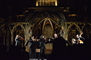 We were there at night, so we couldn’t get a good picture of the stained glass. But in a darkened chapel, with soft lighting of the front of the room, Les Soloistes Français had a lovely place to perform. Opening with the Pachelbel Canon, and using Albonioni’s Adagio as a segue, the centrepiece of the program was Vivaldi’s Four Seasons. I never realized six stringed instruments could produce such power. It was a magnificent ending to a very nice day.