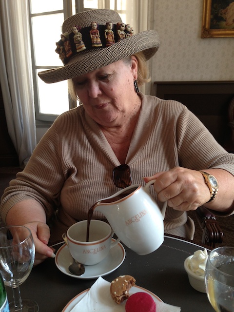 With this kind of acreage inside and out to cover, one works up an appetite. Fortunately, there are solutions to that problem. Our choice was to take advantage of a surprise discovery. Angelina’s has a cafe in the chateau. Angelina’s has been on Anita’s list of “treat” stops since we started planning this trip, for no reason other than the hot chocolate. After some quiche and salad, we settled in to hot chocolate l’africain and macarons. Macarons (not to be confused with macaroons, the coconut cookies you may be familiar with) are little sandwiches of meringue wrapping a delicate creme filling.