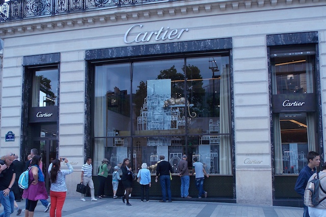 I learn a lot from Anita on these excursions. For instance, how many husbands do you know who would recognize the name Guerlain? I’m curious about the bee motif in the perfume bottle. Napoleon’s symbol was the bee; I wonder if there is some obscure political reference here?The French term for window-shopping is strictly translated “window-licking”. I’m pretty sure Anita was taking that term literally at this little shop (recognize the green sweater in the lower left of the window?). How can you leave Cartier’s empty handed? Leaving the credit card at home is a good start!